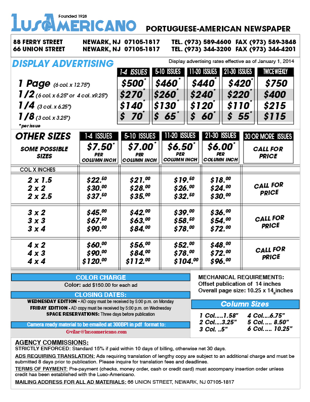 Portuguese language newspaper published twice a week for the Portugese-American. Distributed in the greater metropolitan Newark, NJ marketDemographics